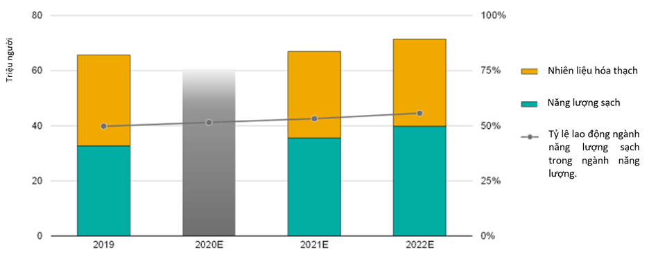 Ghi chú: Việc làm trong ngành năng lượng sạch bao gồm: năng lượng sinh học, năng lượng hạt nhân và năng lượng tái tạo để phát điện, truyền tải và tích trữ, sản xuất xe điện, sử dụng năng lượng hiệu quả. Các ước tính được lập mô hình cho năm 2020 đến năm 2022 dựa trên dữ liệu đầu tư và cân bằng năng lượng mới nhất của IEA, với giả định rằng cường độ lao động và tiềm năng tạo việc làm của đầu tư mới không đổi qua các năm. Các vụ đóng cửa do đại dịch Covid-19 được thực hiện năm 2020 khó đánh giá thị trường việc làm. Theo đó, ước tính năm 2020 chỉ mang tính chất tham khảo.