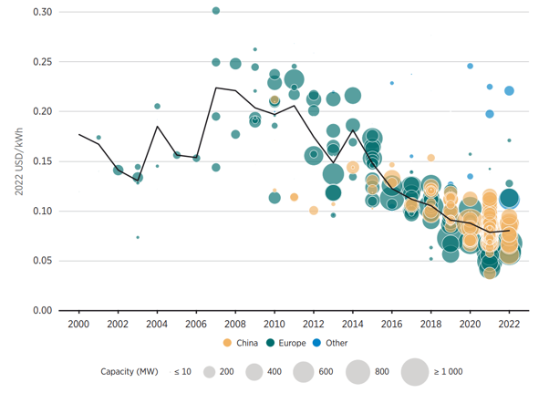 Hình 1. Chi phí sản xuất điện bình quân các dự án điện gió ngoài khơi giai đoạn 2000 – 2022. (Nguồn IRENA)