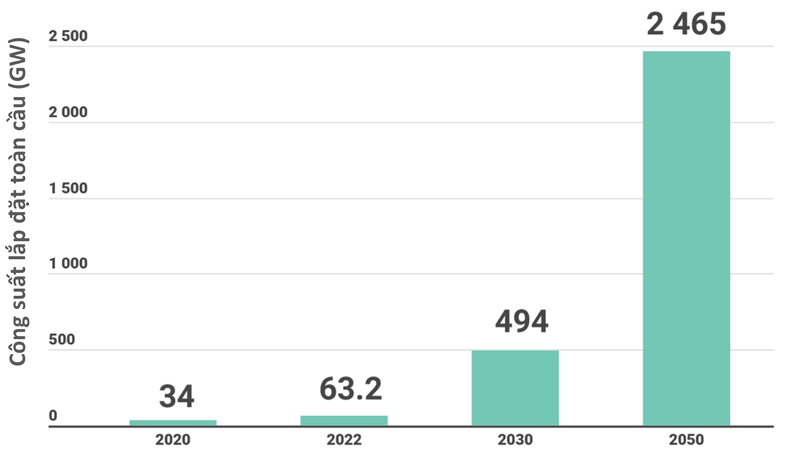 Hình 2. Công suất lắp đặt điện gió ngoài khơi toàn cầu và dự báo tới năm 2030, 2050. (Nguồn IRENA)