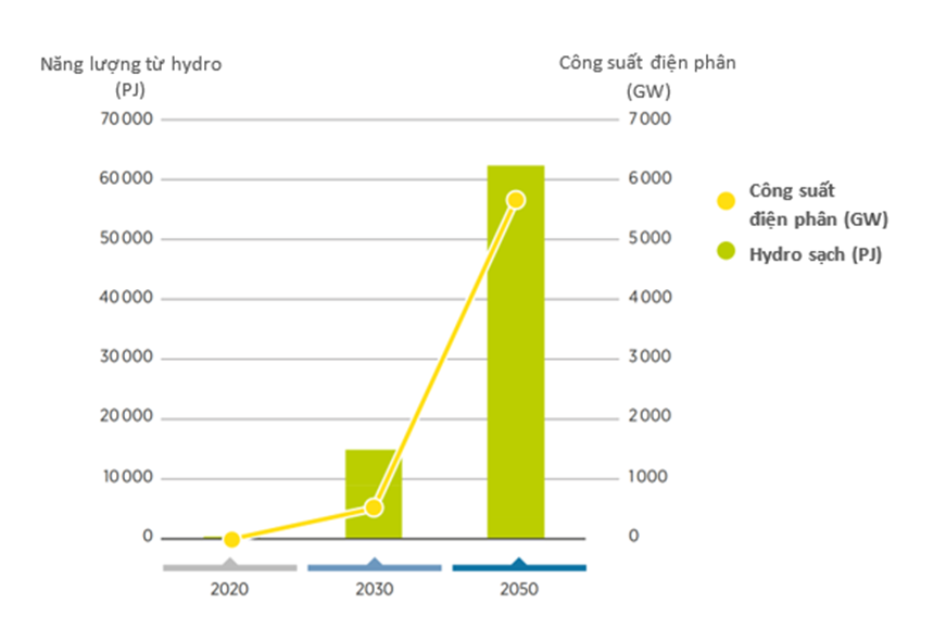 Hình 5. Nhu cầu hydro bằng phương pháp điện phân tăng mạnh tạo cơ hội cho đóng góp của điện gió ngoài khơi. (Nguồn IRENA)
