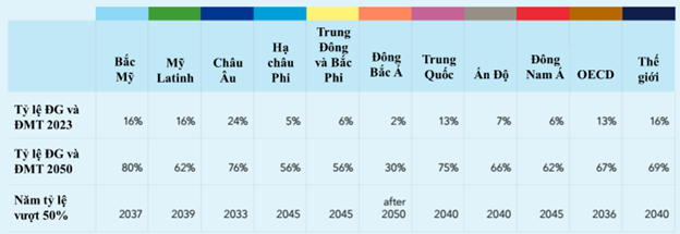 Bảng: Tỷ lệ điện gió (ĐG) và điện mặt trời (ĐMT) trong cơ cấu điện của khu vực và toàn cầu