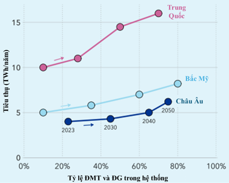 Hình 2. Tăng trưởng và xanh hóa hệ thống điện của ba thị trường điện lớn nhất khu vực: Trung Quốc, Bắc Mỹ và châu Âu.