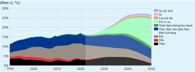 Vào năm 2023, tỷ lệ điện năng sản xuất từ năng lượng gió và mặt trời là 13%, và dự kiến sẽ tăng lên 50% vào năm 2040 và 70% vào năm 2050. Đến năm 2050, 82% tổng điện năng sẽ từ nguồn tái tạo như thủy điện, địa nhiệt, sinh khối, năng lượng mặt trời và gió. Năng lượng hạt nhân chỉ chiếm 6% sản lượng điện, giảm từ 9% hiện tại, mặc dù công suất đặt tăng 41% so với hiện nay. Điều này cho thấy sự thay đổi lớn trong cơ cấu nguồn điện. Khi đó, chỉ 12% điện năng sẽ đến từ nguồn hóa thạch (than, khí và dầu), tạo ra sự đảo ngược đáng kể so với hiện tại, nhưng vẫn chưa hoàn toàn phù hợp với mục tiêu phát thải ròng bằng không.