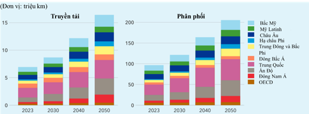Hình 5. Khối lượng đường dây truyền tải và phân phối theo khu vực